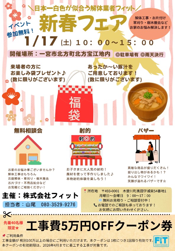 1月17日(土)10時~15時に、弊社土場で「新春フェア」を開催します。